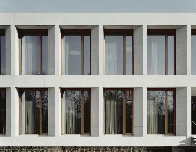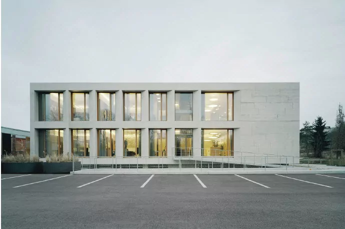 Den Entwurf dafür lieferten die Wittfoht Architekten aus Stuttgart, die für diesen weithin sichtbaren Ort einen klaren, architektonisch in sich ruhenden, zweigeschossigen Baukörper aus Sichtbeton entwickelten, der fortan als Visitenkarte für das Bauunternehmen fungiert.