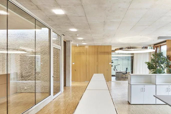 Die Karl Köhler GmbH dürfte zumindest Bauschaffenden ein Begriff sein, denn der Bauunternehmer aus Besigheim in Baden-Württemberg, etwa 25 Kilometer nördlich der Landeshauptstadt Stuttgart, zählt zwar nicht zu den ganz Großen in der Branche, dafür zu den guten Partnern für Architekten und Planer. Das zumindest bescheinigen die Kunden auf der Firmen-Website, die von angenehm kurzen internen Wegen und geringer Bürokratie schwärmen. Womöglich aber wirkt auch der Ort, an dem sich der Firmensitz befindet, durchaus positiv auf die Stimmung der Belegschaft aus. Hier in Besigheim schlängelt sich der Neckar malerisch durch die Landschaft und wird teilweise eingefangen von Weinbergen. Im Rücken haben die Mitarbeiter quasi das beschaulich dahinfließende Wasser, nach vorne blicken sie auf weite Felder und die «Hessigheimer Felsengärten», eines der bedeutendsten Geotope Deutschlands. Eine gewisse innere Ruhe ist hier garantiert. Kein Wunder also, dass die Karl Köhler GmbH diesen Standort weiter ausbauen wollte, und so entschied man sich im Jahr 2013, die bestehenden Gebäude durch einen Neubau zu erweitern. Der sollte nicht nur Raum für Büros schaffen, sondern auch als Sozialgebäude für die Mitarbeiter zur Verfügung stehen. Ein Ort also, der die Kommunikation und den Teamgeist fördert.