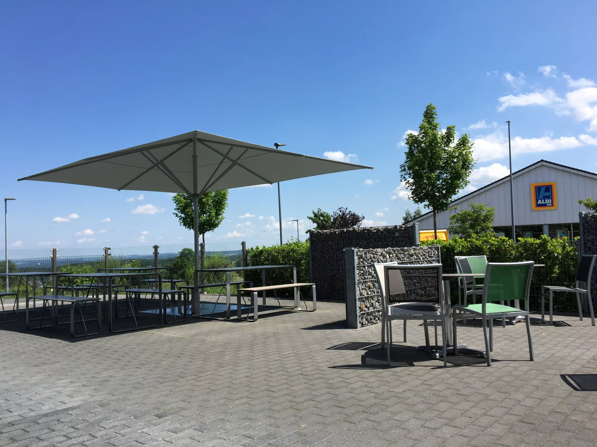 - MAY Gewerbe-Schirme SCHATTELLO 500 x 400 cm mit freistehender Standplatte