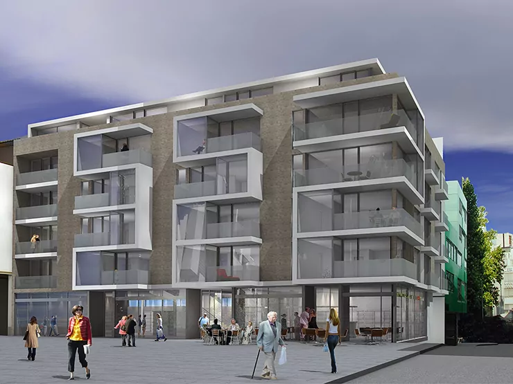 Direkt am neu gestalteten Stuttgarter Hospitalhof liegt das Wohn- und Geschäftshaus, ein souverän modern gestaltetes Gebäude mit viel Glas, umgeben von lebendiger Geschichte. Das Hospitalviertel ist eine Oase in der Oberen Vorstadt, architektonisch beherrscht von der Hospitalkirche mit ihren gotischen Formen und Fenstern. Dominiert wird der Hospitalhof von hellen Fassaden und einem Innenhof als Rückzugsraum. Das ganze Viertel wirkt wie eine Insel der Ruhe im regen Treiben der Großstadt, zumal es durch einen breiten Gehbereich vom Stadtraum abgegrenzt wird.